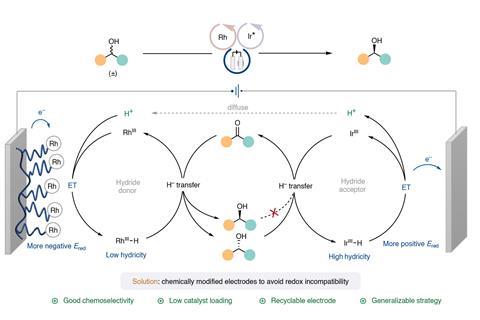 Transition metal catalysts can electrochemically convert a mixture of a pair of enantiomers into a single enantiomer. Using an iridium catalyst to first reduce a secondary alcohol into a ketone at the anode, with a rhodium catalyst then oxidising the ketone back into the alcohol at the cathode, is one approach. Fine-tuning the catalyst helps selectively reduce only one of the enantiomers, yielding an enantiomerically pure product.