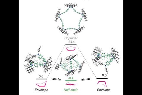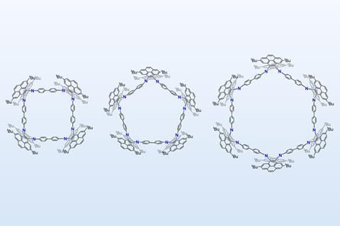 The polygonal macrocycles created by Zhaohui Wang and co-workers at the East China University of Science and Technology may offer a new way to unpick the conformational dynamics of cyclobutene, cyclopentane and cyclohexane. Their molecules feature four, five or six dipyrene-fused dihydropyrazine corners, which introduce flexibility and allow the rings to adopt low-energy conformations similar to those of classic cycloalkanes.